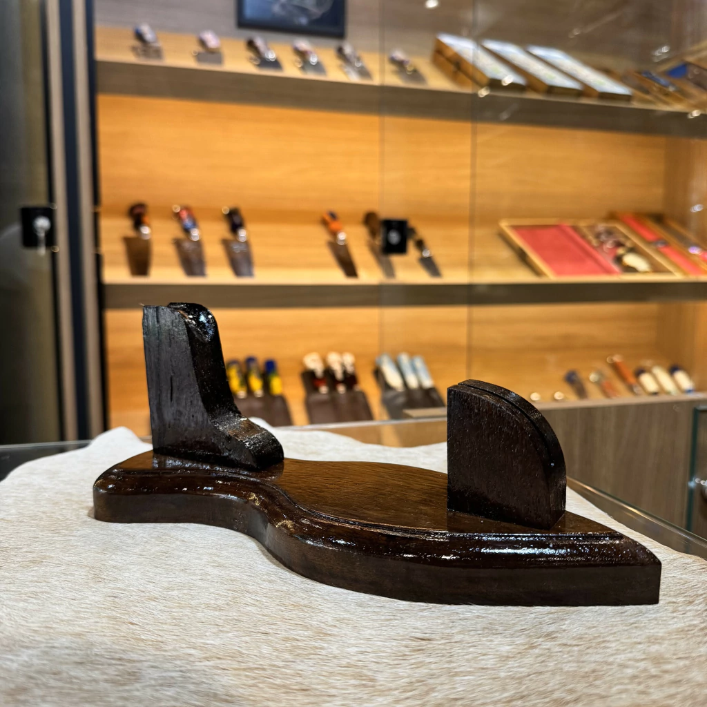 Elegante, leve e funcional. Este suporte é produzido em madeira maciça com acabamento envernizado à mão, destacando as nuances naturais do material. Seu design rústico e equilibrado é ideal para quem deseja expor uma faca artesanal com sofisticação, mesmo em espaços reduzidos.